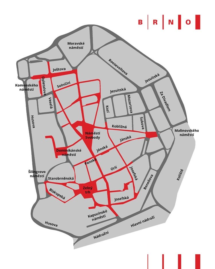 Ćerveně jsou vyznačena místa v brněnské pěší zóně, kde bude provoz jednokolek zcela zakázán.