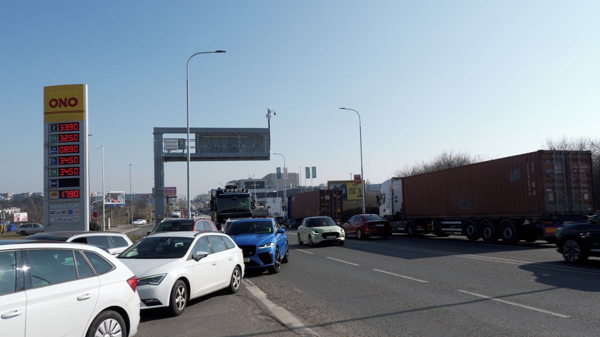 Fronta aut před čerpací stanicí ve Štěrboholech