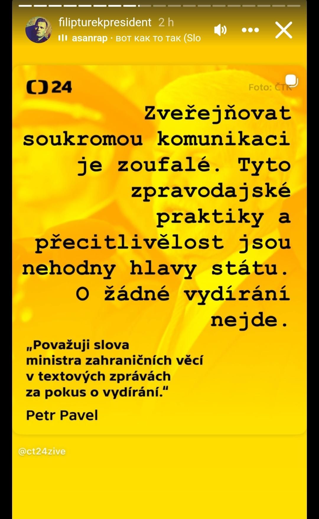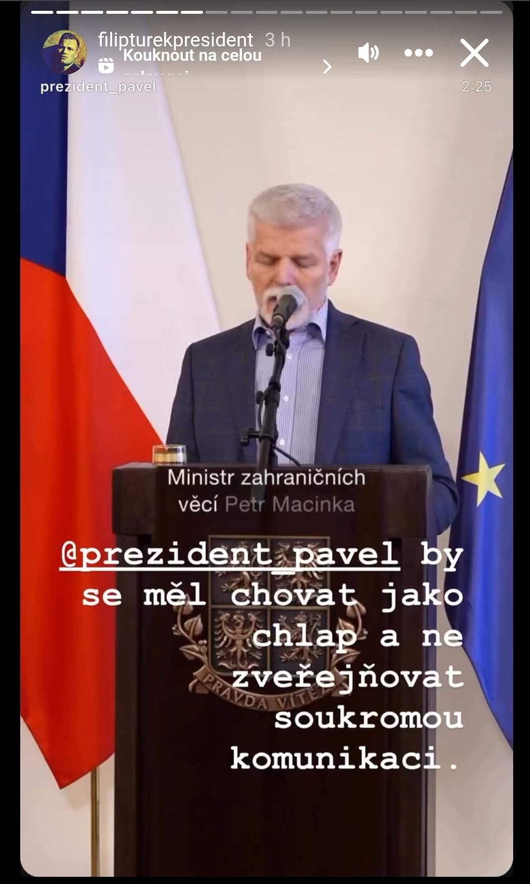 Sdílel také samotný záznam tiskové konference prezidenta. „Prezident Pavel by se měl chovat jako chlap a ne zveřejňovat soukromou konverzaci,“ napsal. Pokusil se tak proti Pavlovi obrátit jeho vlastní slova, kterými v půlce prosince vyzval Turka, aby přijal zodpovědnost za své činy, choval se jako chlap a nevymýšlel si jako malý kluk.