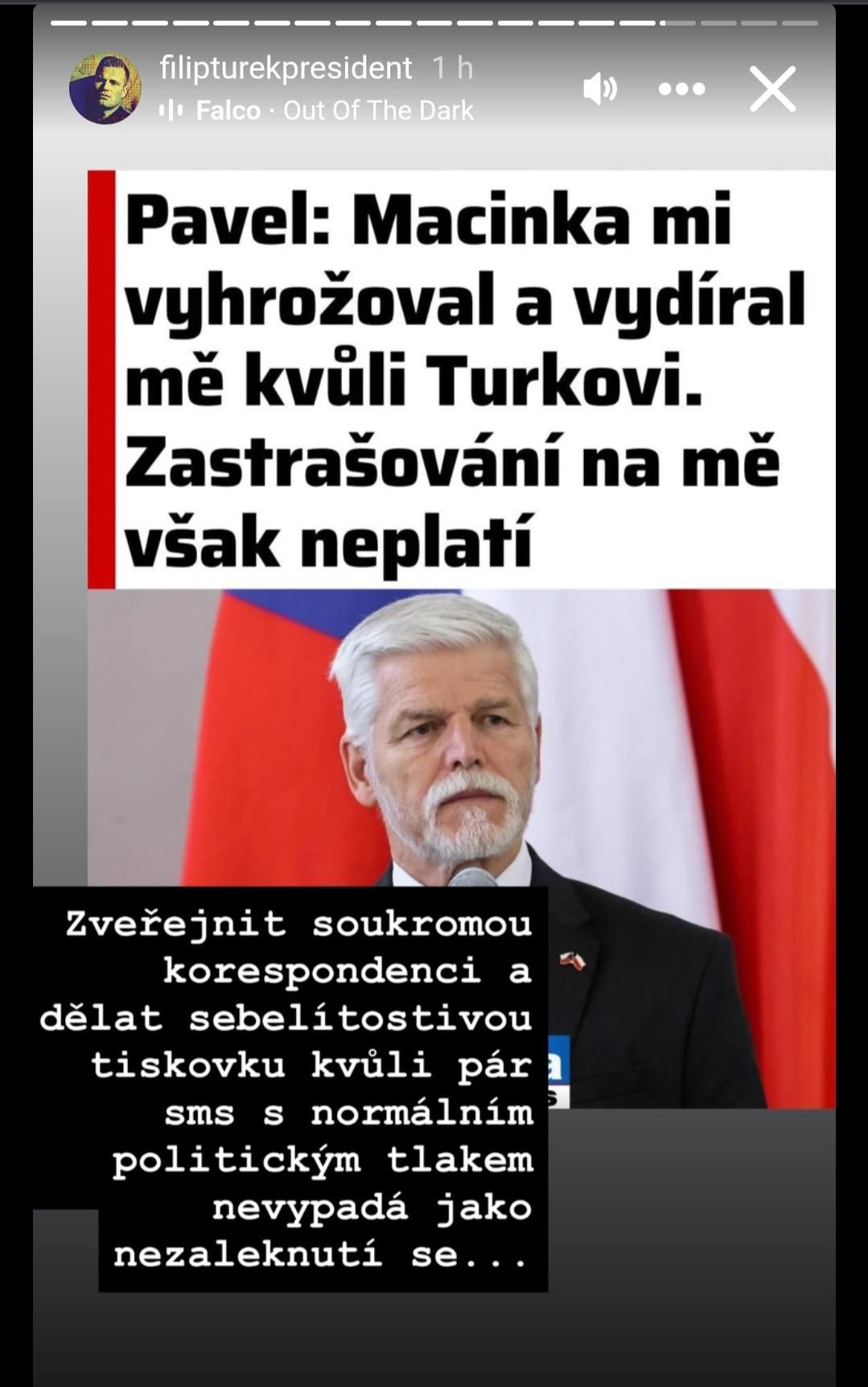 Turek na konto událostí zveřejnil sérii příspěvků na svém Instagramu. Do tzv. stories, které po 24 hodinách zmizí, přidal například citát prezidenta, který Macinkovy zprávy označuje za pokus o vydírání, a doplnil ho slovy: „Zveřejňovat soukromou komunikaci je zoufalé. Tyto zpravodajské taktiky a přecitlivělost jsou nehodny hlavy státu. O žádné vydírání nejde.“