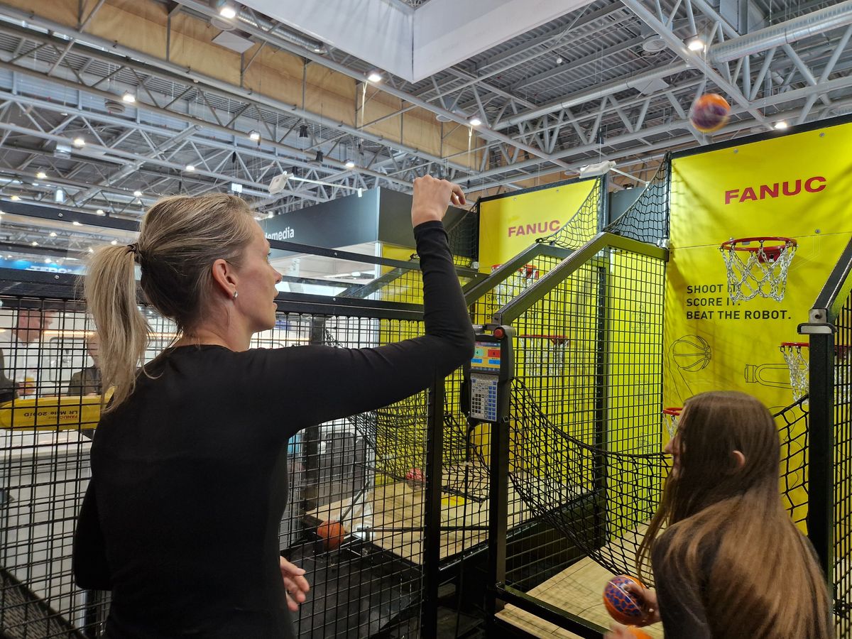 „Robot hází na koš a lidé se ho snaží porazit. Je to možné, ale je to náročné kvůli přesnosti. Řekl bych, že uspěje v 99 procentech hodů, a pokud ne, je to kvalitou míčku nebo špatným uchopením,“ řekl Novinkám Kamil Bartoš, obchodní zástupce společnosti Fanuc, která robota na veletrhu představuje.