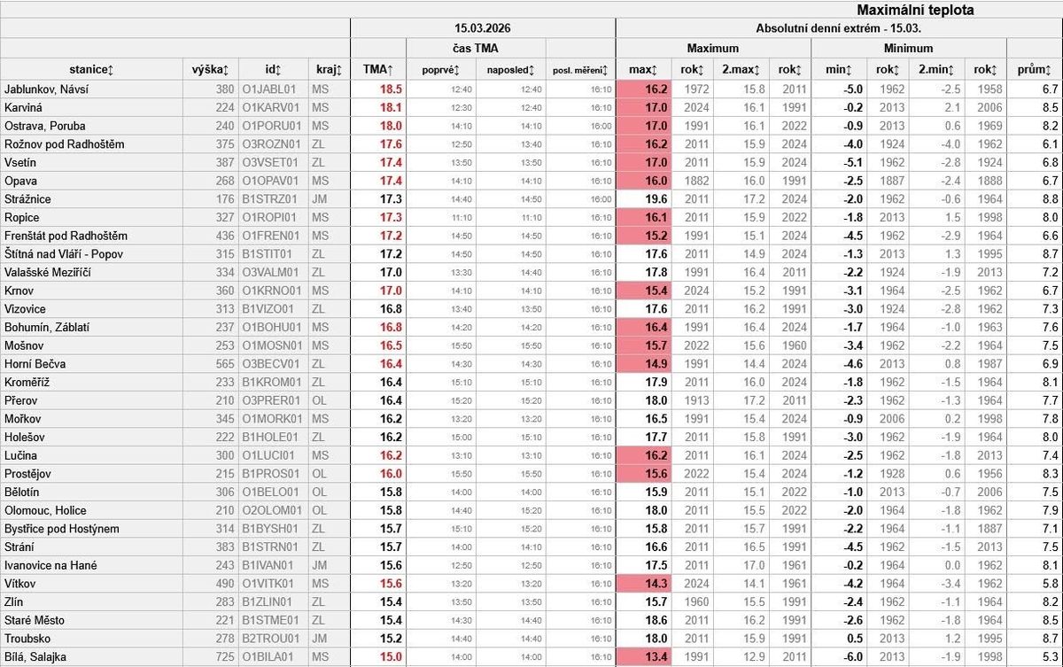 Nejvyšší teplotu v neděli krátce po poledni naměřil Jablunkov na Frýdecko-Místecku, a to 18,5 stupně Celsia. Překonal tak dosavadní rekord k 15. březnu z roku 1972, který dosahoval 16,2 stupně Celsia.