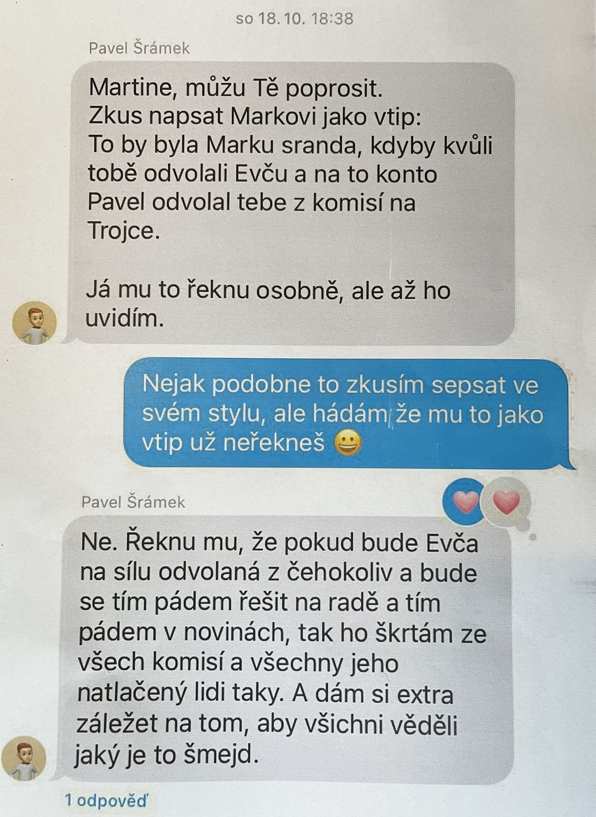 „…pokud bude Evča na sílu odvolaná z čehokoliv a bude se tím pádem řešit na radě a tím pádem v novinách, tak ho škrtám ze všech komisí a všechny jeho natlačený lidi taky. A dám si extra záležet na tom, aby všichni věděli jaký je to šmejd.“