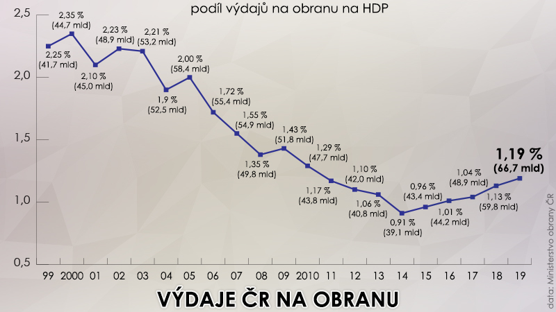 Letos má Česko na obranu vydat 66,7 miliardy korun, což by mělo být 1,19 procenta HDP. Současná vláda se přitom ve svém programovém prohlášení zavázala, že do konce volebního období, tedy do roku 2021, zvedne podíl obranných výdajů na 1,4 procenta HDP. I tento závazek ve skutečnosti znamená, že obrana bude každoročně dostávat o víc než 10 miliard korun více, což se ale zatím neděje.