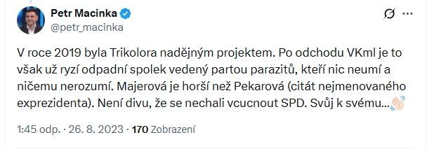 Schytala to od něj také Trikolora, která kandidovala společně s SPD. „V roce 2019 byla Trikolora nadějným projektem. Po odchodu Václava Klause ml. je to však už ryzí odpadní spolek vedený partou parazitů, kteří nic neumí a ničemu nerozumí. Majerová je horší než Pekarová (citát nejmenovaného exprezidenta). Není divu, že se nechali vcucnout SPD. Svůj k svému,“ napsal Macinka v roce 2023.