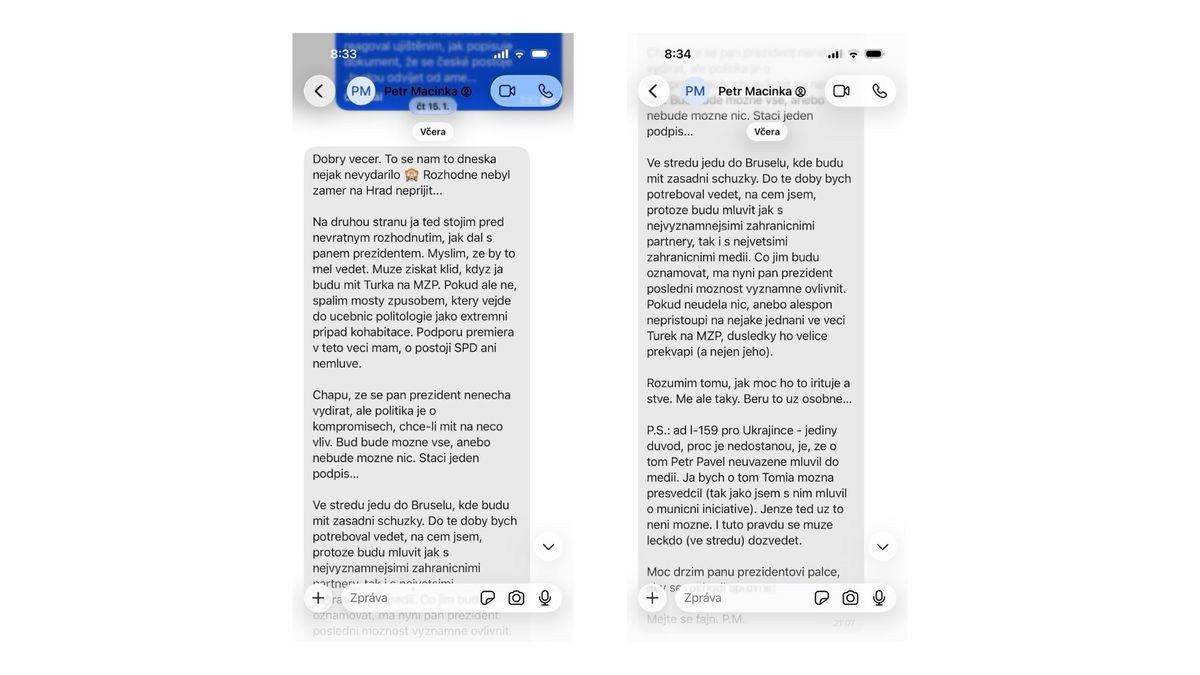 Petr Macinka zaslal prezidentu Pavlovi prostřednictvím jeho poradce SMS zprávy, které prezident považuje za vyděračské. Macinka ve zprávě píše o potřebě dostat Filipa Turka na ministerstvo životního prostředí. Prezident oznámil, že v souvislosti se zprávami podal podnět bezpečnostním složkám a hodlá zprávy poskytnout právníkům k posouzení, zda se nejedná o naplnění skutkové podstaty trestného činu vydírání. Premiér Andrej Babiš označil Macinkův způsob komunikace za nešťastný a vyzval k jednání u jednoho stolu. Zároveň uvedl, že incident nepovede k odvolání Macinky z vlády.