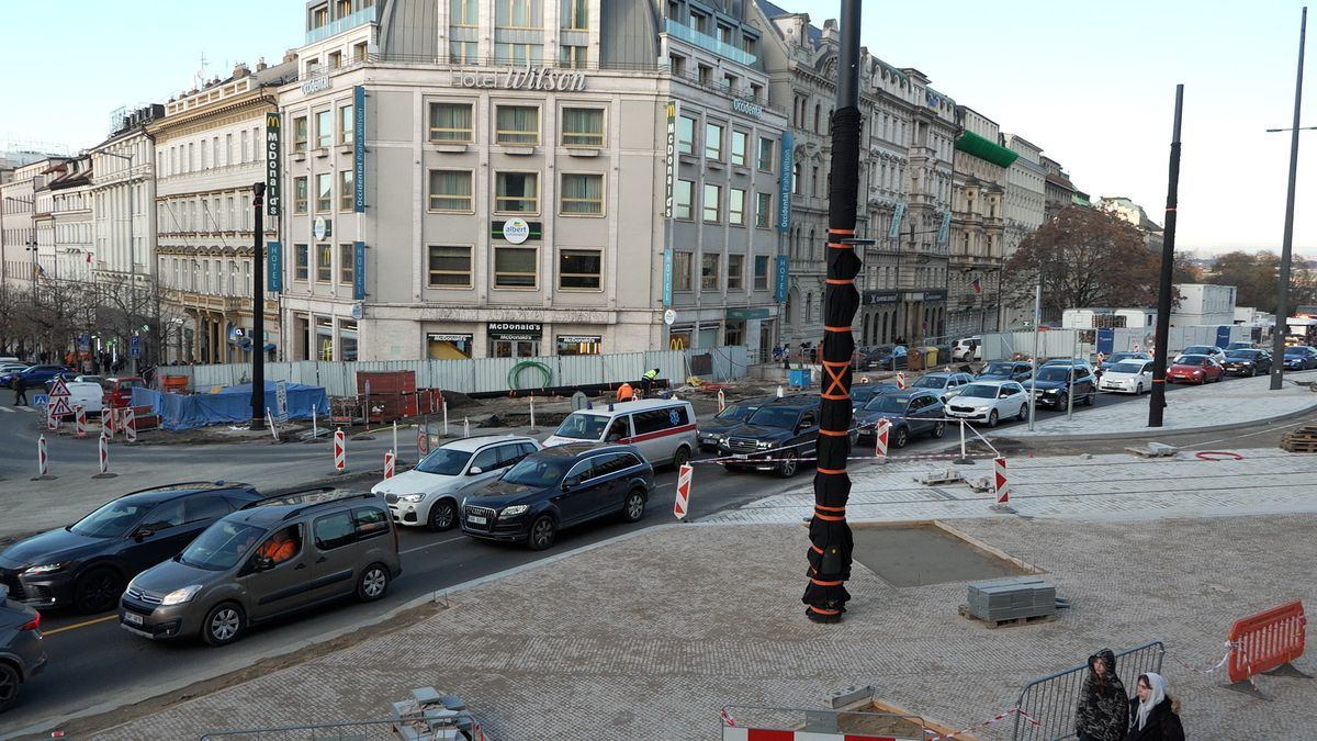 Magistrála už často není průtahem Prahou, ale jedním velkým parkovištěm. Vidět to je především u Národního muzea, kde se staví trať pro navracející se tramvaje, jež propojí Václavské náměstí s Vinohrady. „V dopravní špičce počítejte se zdržením více než 30 minut,“ upozorňuje TSK.