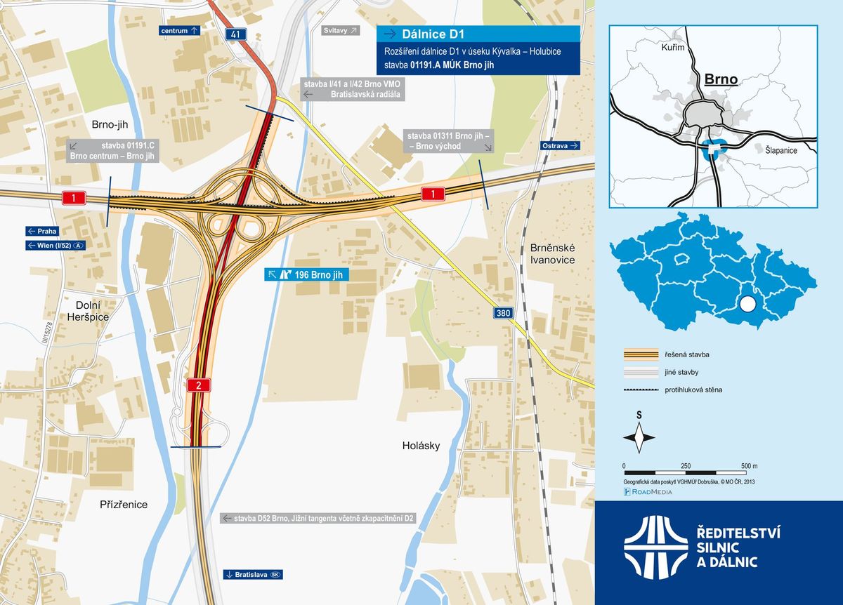 Křižovatka Brno-jih se změní v megastavbu. Jde o úsek dlouhý na D1 zhruba 1,5 kilometru. Na novém křížení vznikne 14 mostů a tři celkem kilometr dlouhé protihlukové stěny. Náklady se odhadují na 3,8 miliardy korun. Novým křížením projedou poprvé auta v listopadu 2027.