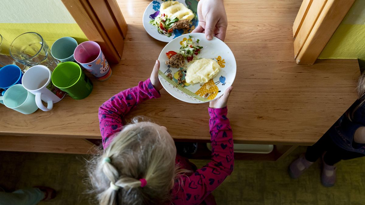 Kuchařky krmí i děti ve školce, které mají denně dvě svačinky a oběd celkem přibližně za 48 korun. Těm nejmladším je teprve okolo dvou let a často se s některými potravinami seznámí až tady.