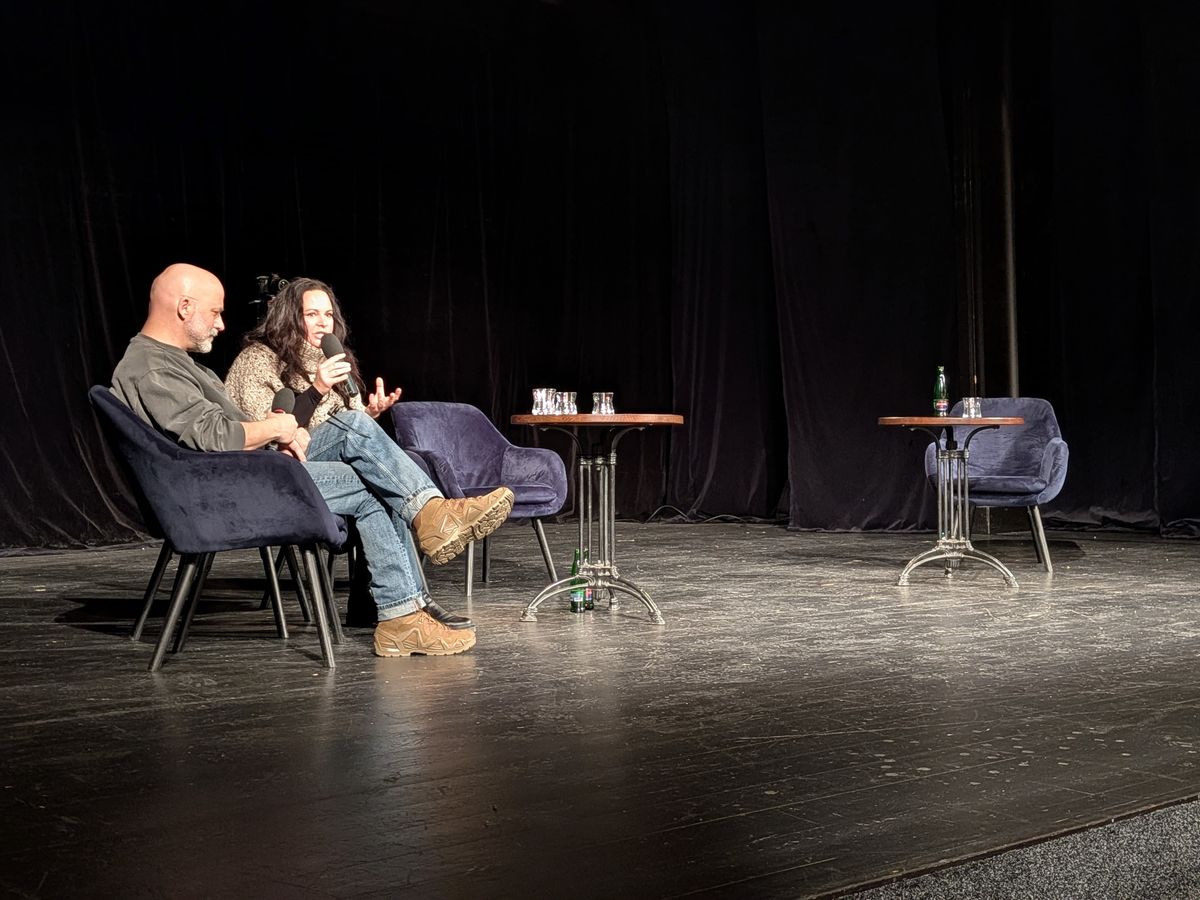 Hynek Čermák s Jitkou Čvančarovou debatují na jevišti Divadla Palace, volné křeslo vpravo čeká na ministra Klempíře, ten prý nedorazí.