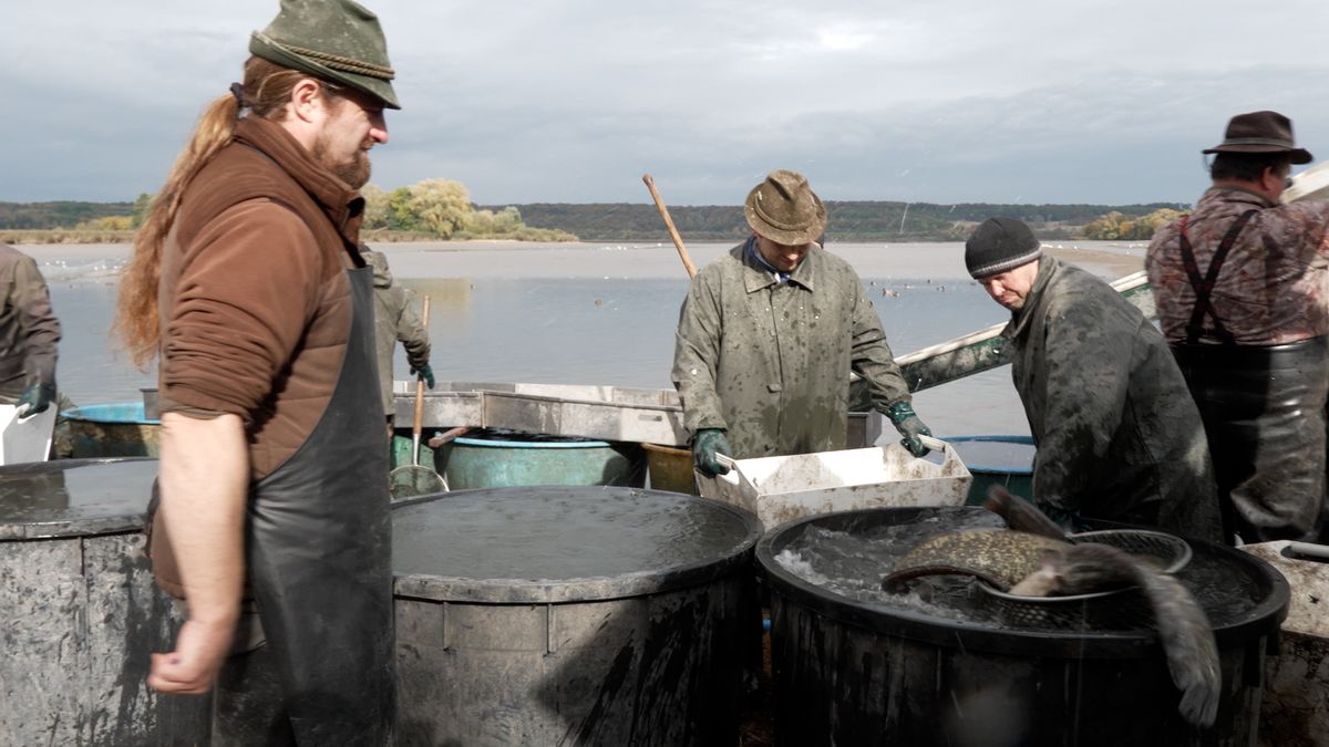 Třídění ryb u břehu, většinu úlovku tvoří kapři určení pro vánoční trh.