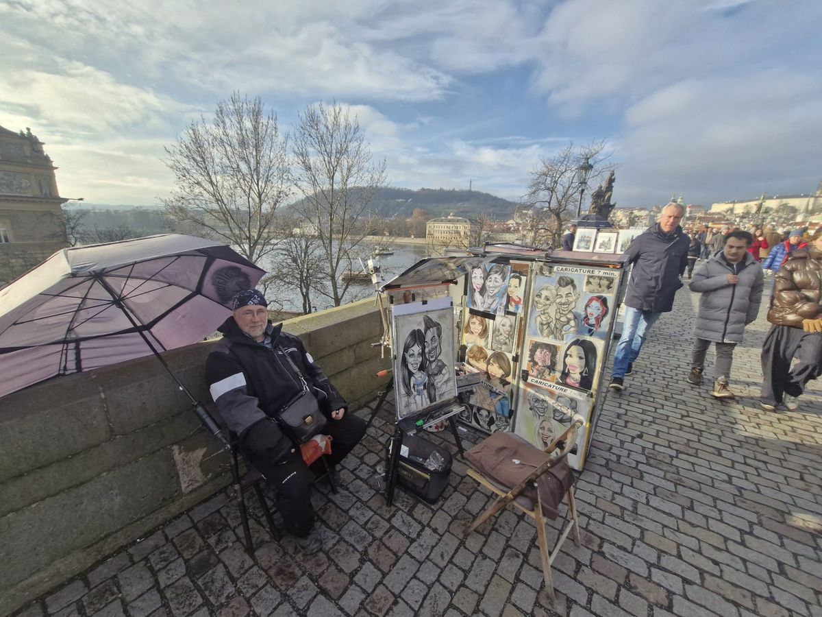 Na Karlově mostě již tradičně panoval velký shon. „Musím ale říct, co to tu mám za ten čas nasledováno, že teď o Vánocích je jich o to poznání více. Každopádně všichni jsou moc milí,“ popsal Novinkám Slavomír Vybíhal z Prahy, karikaturista, který na mostě přes řeku, spolutvořícím Královskou cestu, portrétuje procházející lidi.