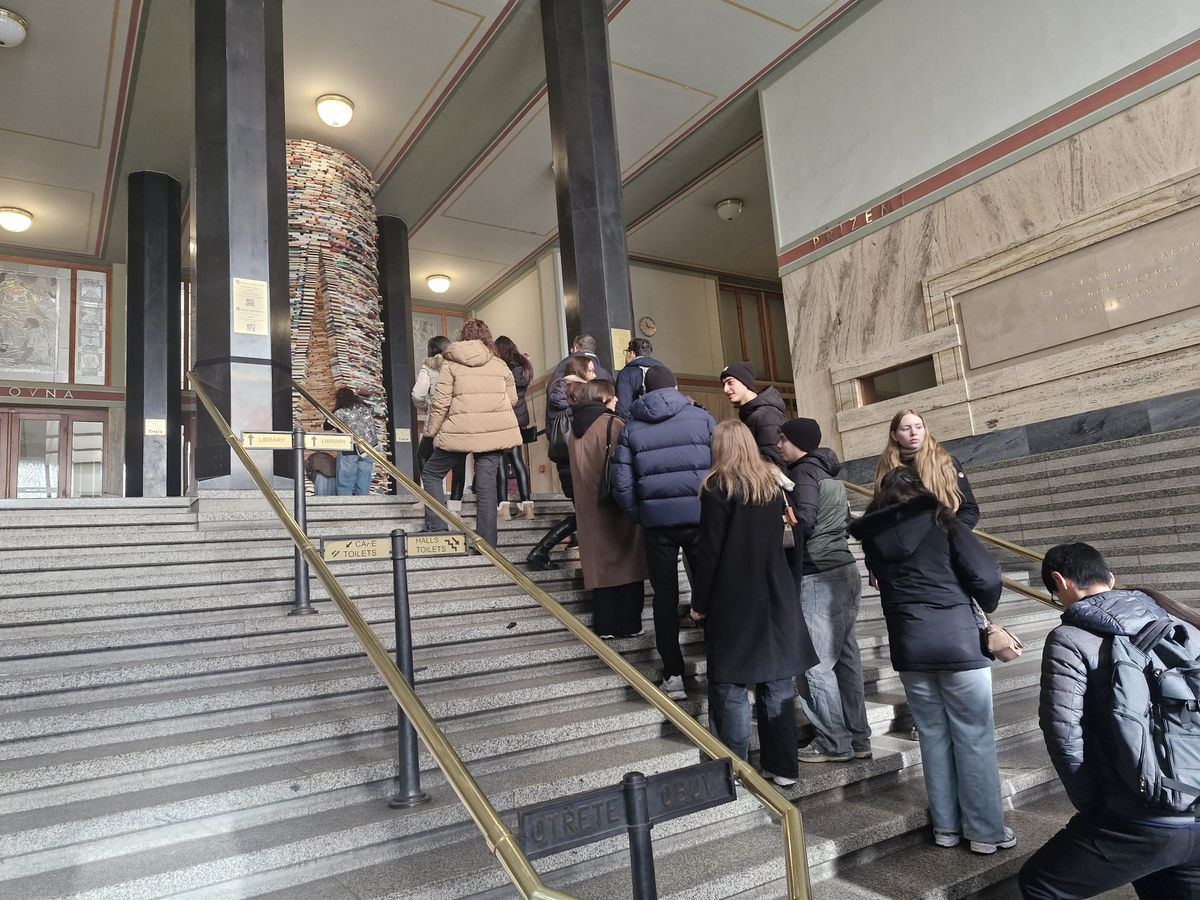 Velká fronta v pražské knihovně na Mariánském náměstí.