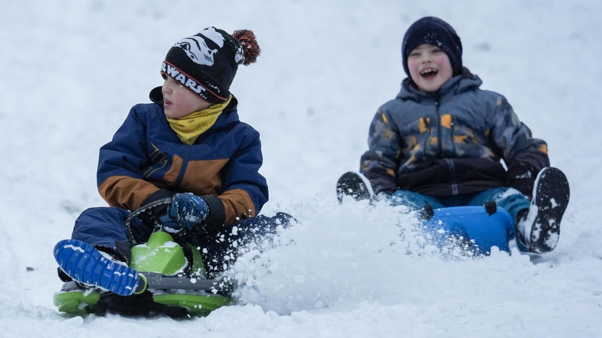 Sníh a teploty pod bodem mrazu vylákaly děti na boby do Riegrových sadů na pražských Vinohradech.