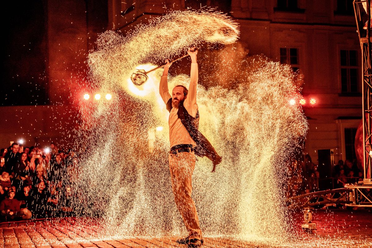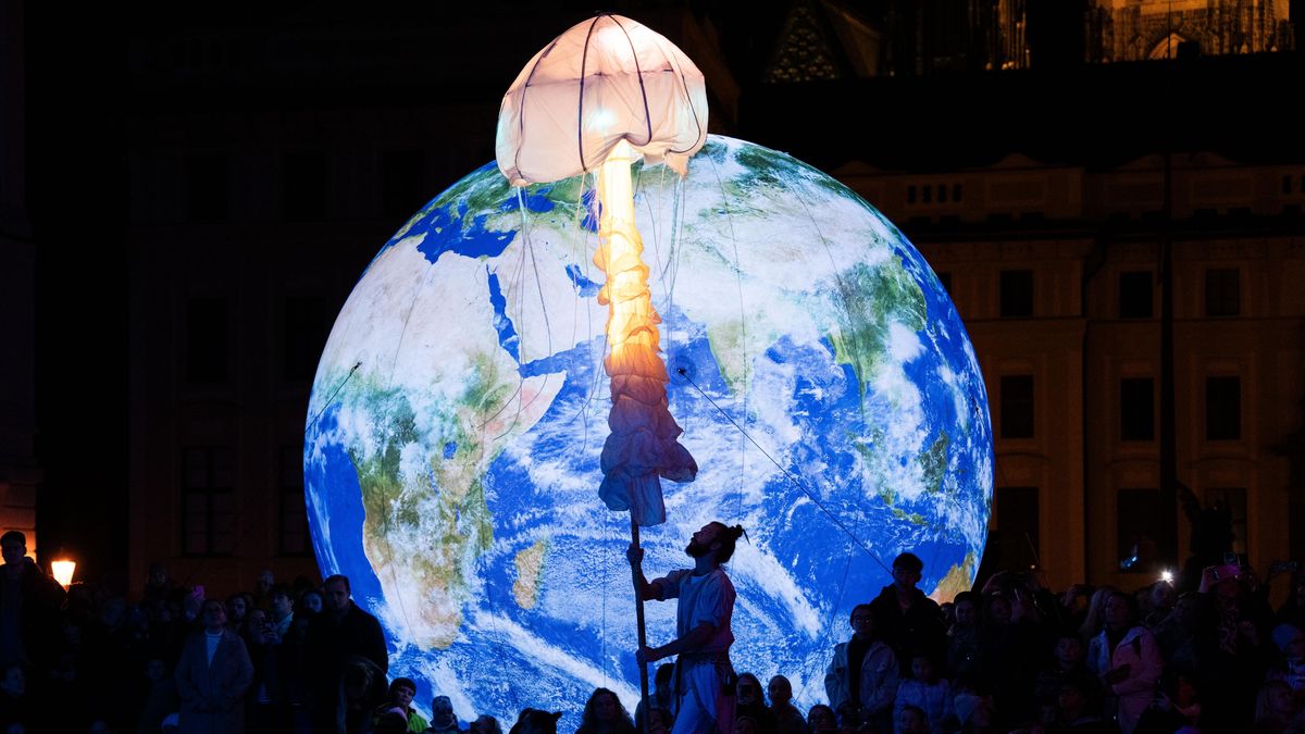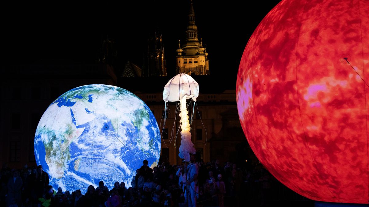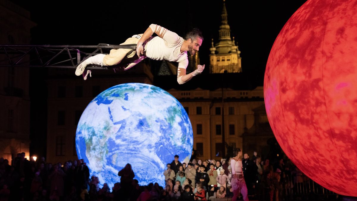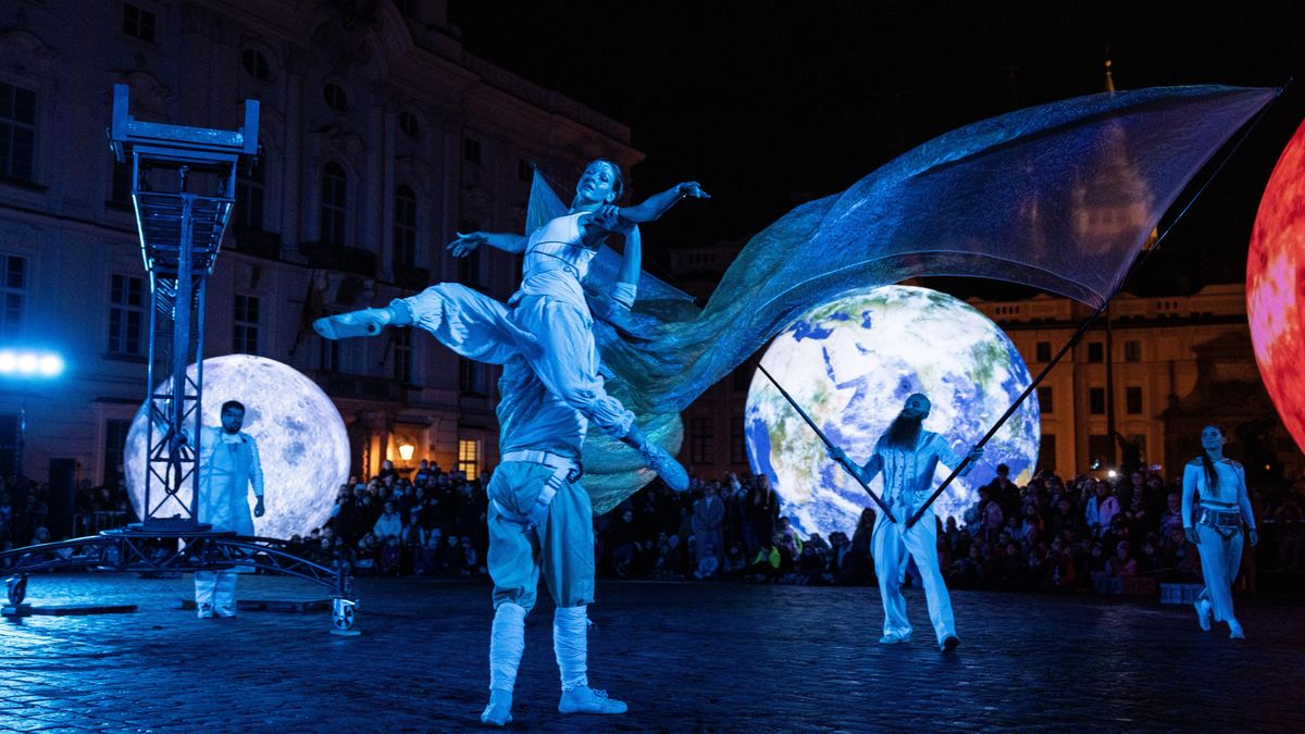 V rámci kosmického festivalu Czech Space Week 2025 mohli diváci na Hradčanském náměstí sledovat podmanivé vizuální představení První krok divadla V.O.S.A. Pomocí akrobacie, obřích loutek, hudby a světel sledovali lidé na náměstí příběh o balancování mezi fyzikálními zákony světa.