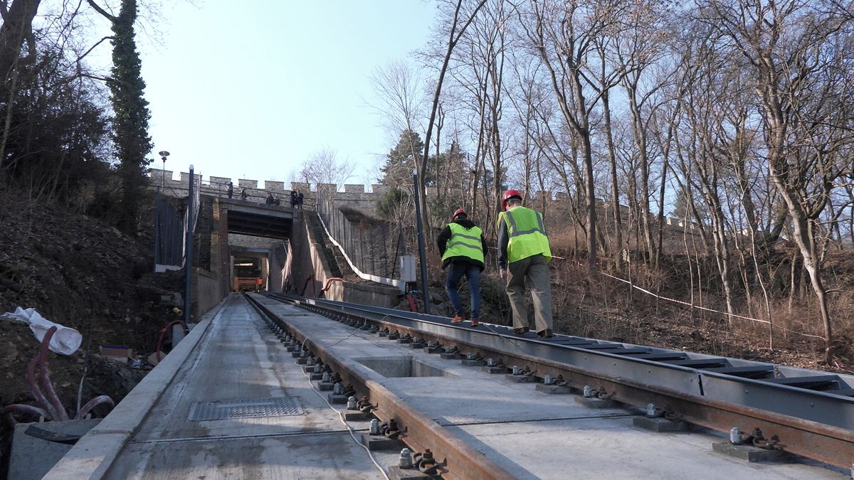Rekonstrukce petřínské lanovky vstupuje do další fáze. Na trati se dokončují poslední části kolejí a současně pokračují práce na technologickém zázemí i vybavení podél celé dráhy.