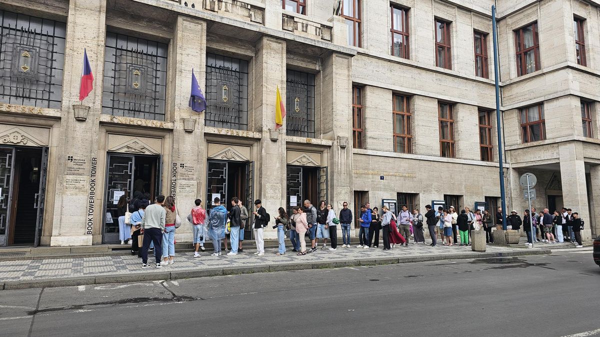 „Čekali jsme hodinu,“ řekl španělsky mluvící muž, který v sobotu po poledni postával ve frontě se dvěma ženami. Když se konečně dostali dovnitř, následovalo povinné focení a natáčení. „Hezké. Stálo to za to,“ dodal po chvíli. Do knihovny se prý zastavili cestou z Karlova mostu na Staroměstské náměstí, jak to radí sociální sítě.