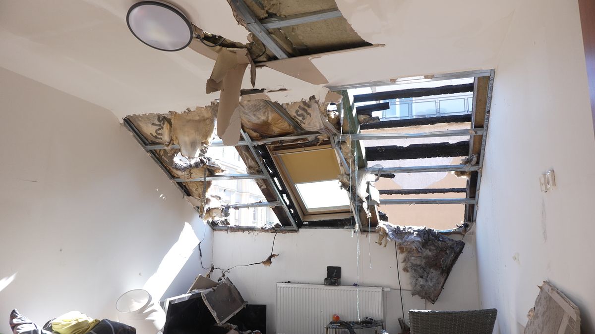 „Vypadá to tady šíleně, chybí celý kus střechy. Kromě očí pro pláč nám zbylo trochu oblečení, nevíme, jestli třeba nějaké spotřebiče budou fungovat,“ vyprávěla v podkrovním bytě, kterému se zčásti zhroutila střecha a tašky teď leží rozbité a rozsypané u ní v obývacím pokoji.
