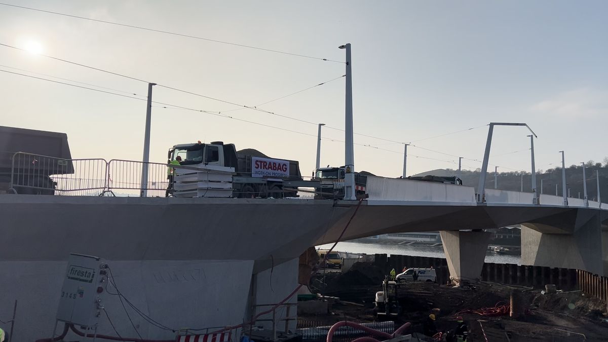 V rámci zatěžovací zkoušky nejprve vyjelo do střední části mostu celkem osm vozidel (pole č. 4), následně do části mostu blíže Podolí šest vozidel (pole č. 6).