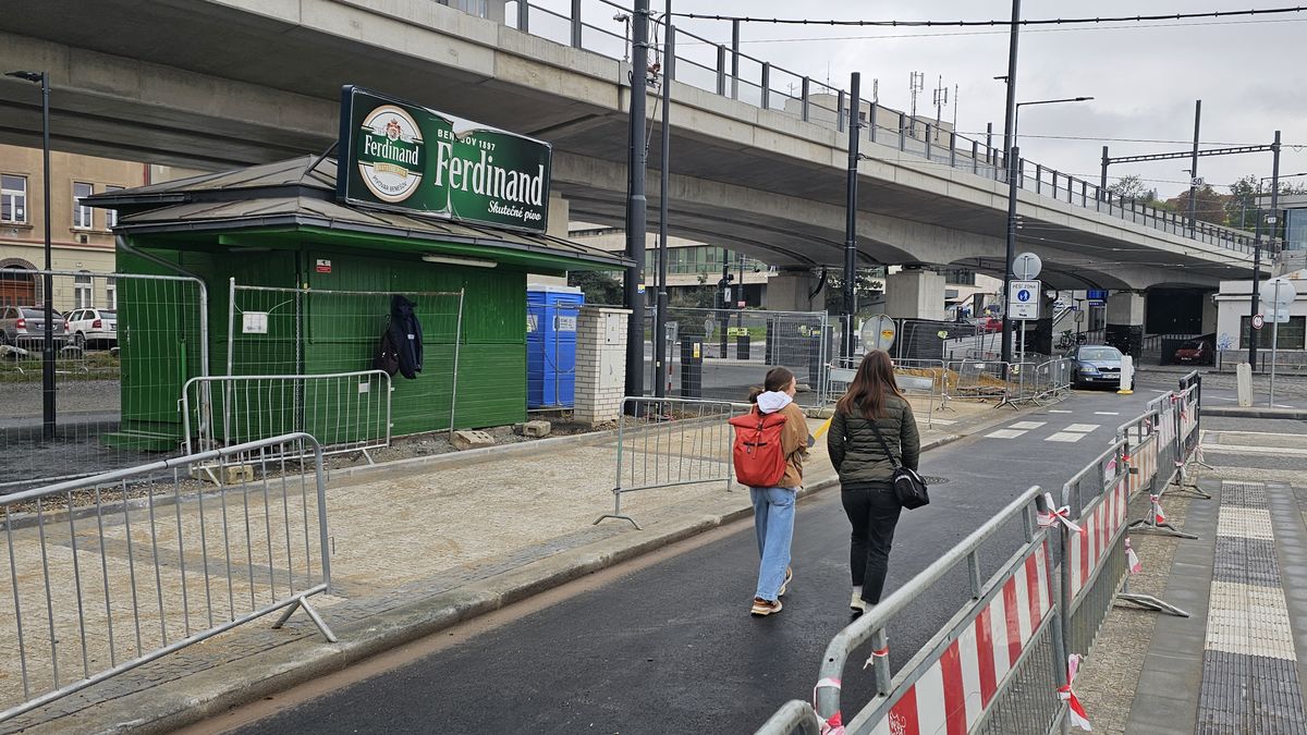 Celá ulice ale zatím zůstává rozvrtaná. U zastávky Výstaviště se ozývá klepání kladívek a jedna dlažební kostka za druhou se pod rukama dělníků stává součástí nového povrchu chodníku. Slavný zelený stánek „Ferdinand“ s dlouhou historií zůstává přímo u zastávky zavřený, mimo průchodů k zastávce mezi zábranami je ještě celá lokalita oficiálně staveništěm.