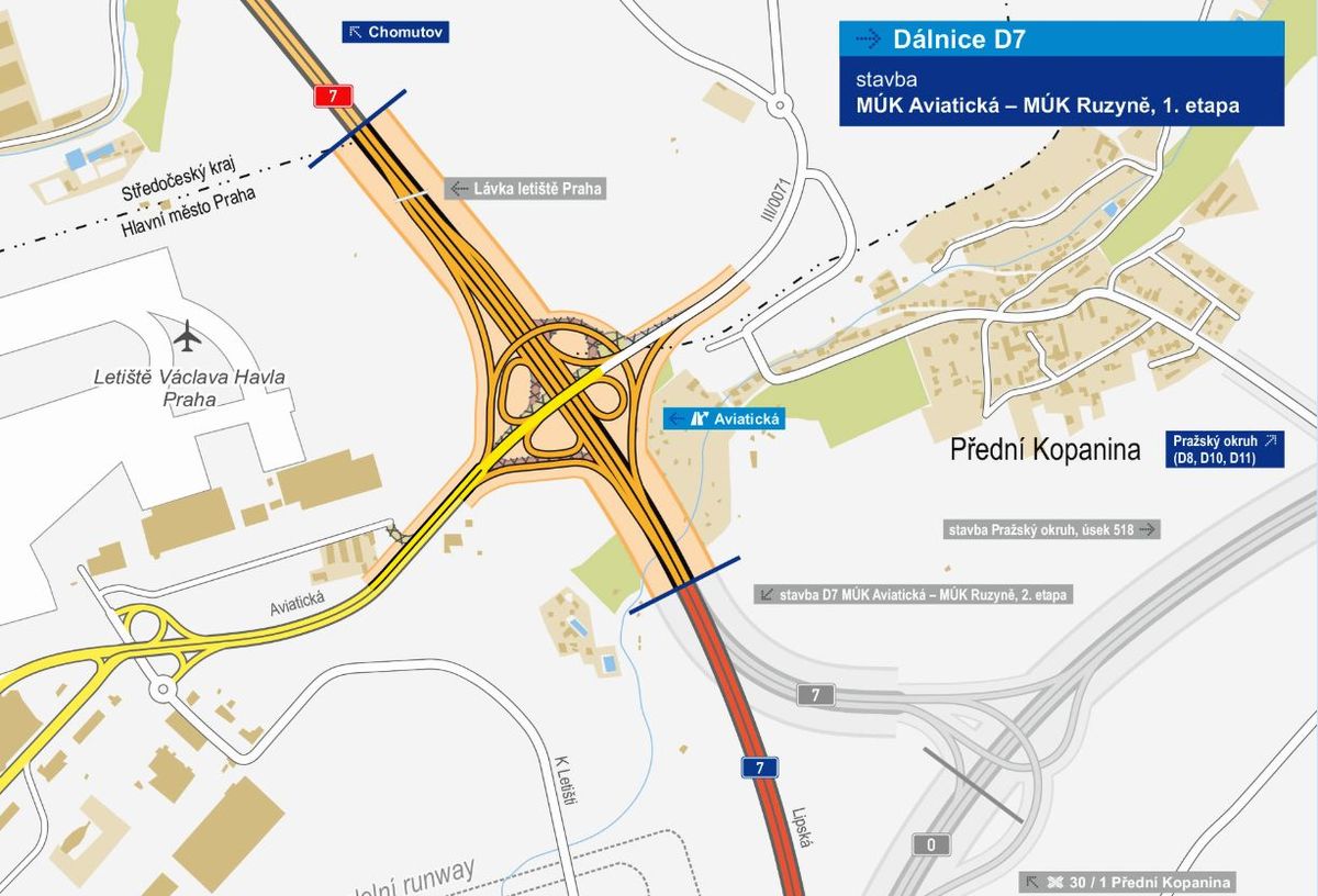 Vše se současně připravuje i na to, aby byl začátek dálnice D7 v budoucnu rozšířen ze čtyř na šest pruhů, a také na chystané napojení na další severozápadní část Pražského okruhu.