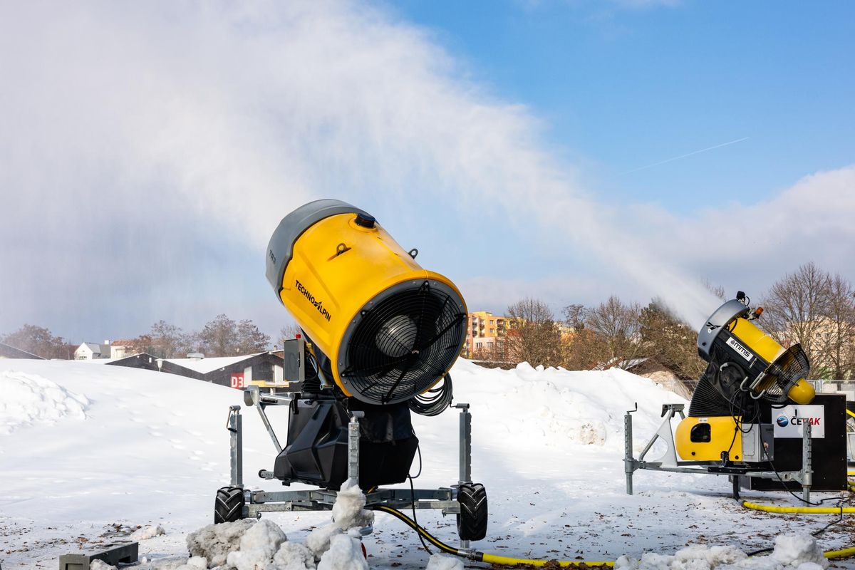 Sněžná děla chrlí na výstavišti umělý sníh.