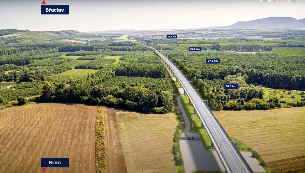 Na vizualizaci vysokorychlostní trať ve směru Břeclav. Po pravé straně Pálava.