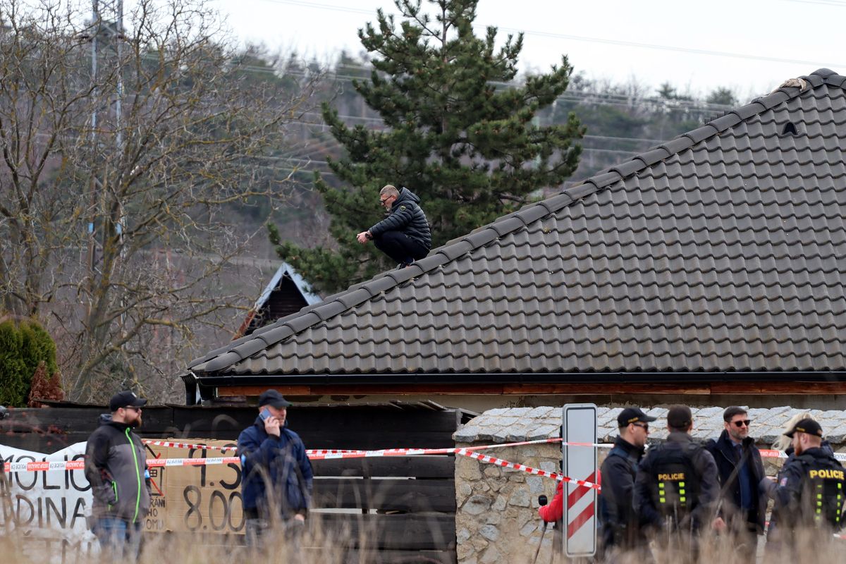 Majitel černé stavby František Sklenář na střeše svého domu.