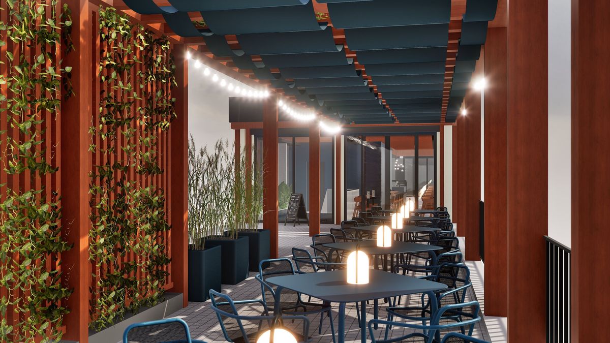 Terasa budoucí kavárny na náplavce v Brně ve vizualizaci