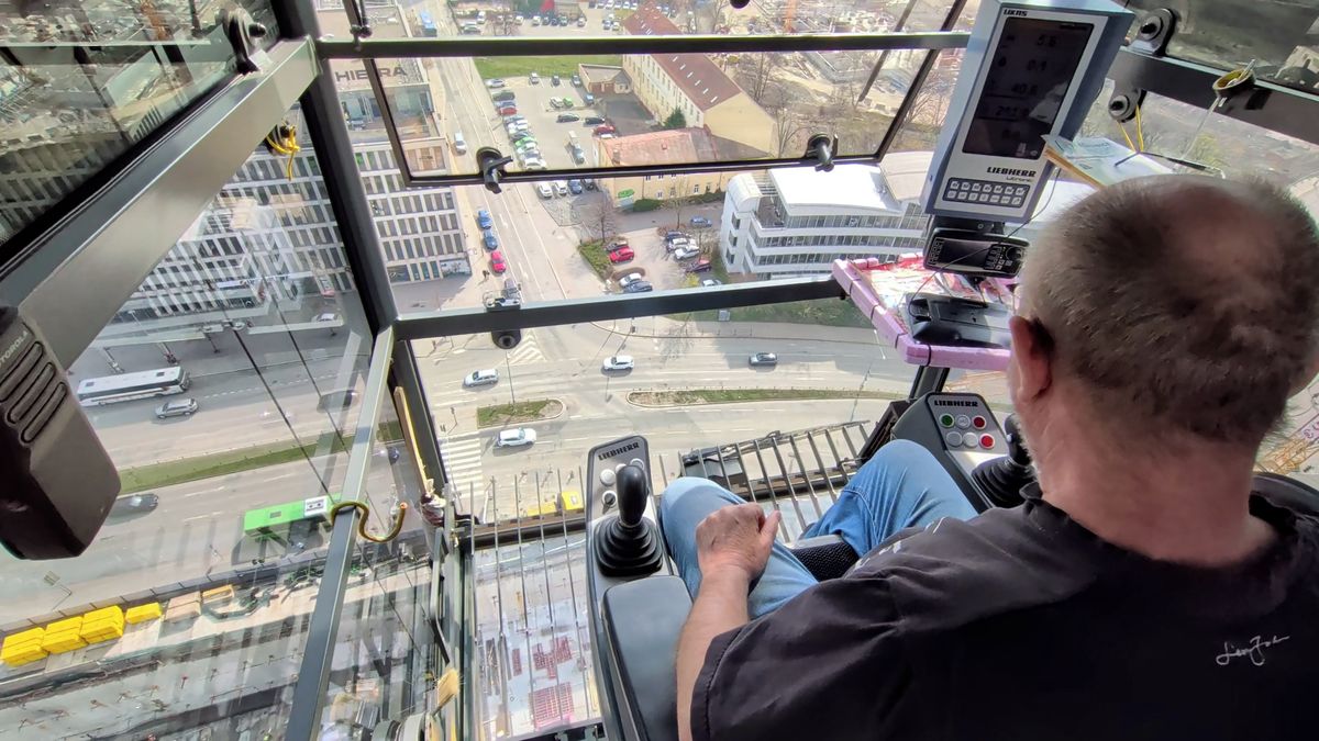 „Celý den jsem v jeřábu,“ vypráví nám v jeho malé kabině ve výškách, kde je obklopen joysticky, tlačítky a malými obrazovkami s ukazateli třeba směru a síly větru. „Je to moderní jeřáb, v létě tu bude fungovat i klimatizace,“ dodává.