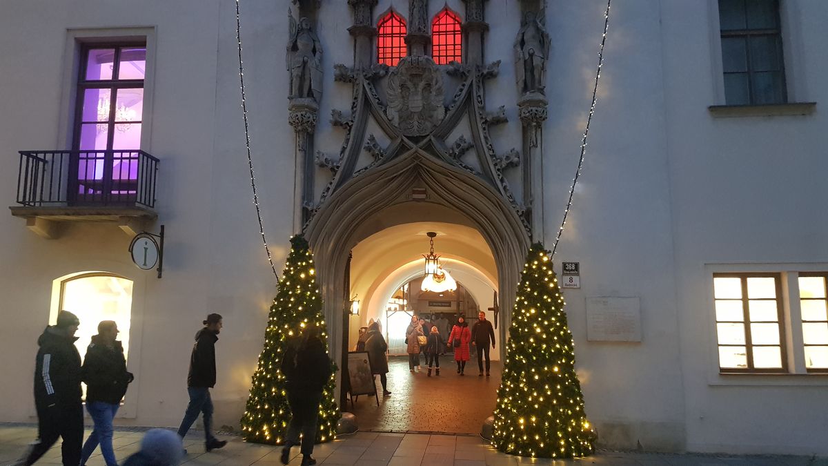 Průchod Staré radnice se symboly města. Kolem a na zimu „oblečeným“ drakem