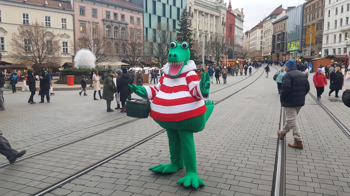 S maskotem brněnských Vánoc se lidé rádi fotografují. Potkat ho lze na řadě míst města