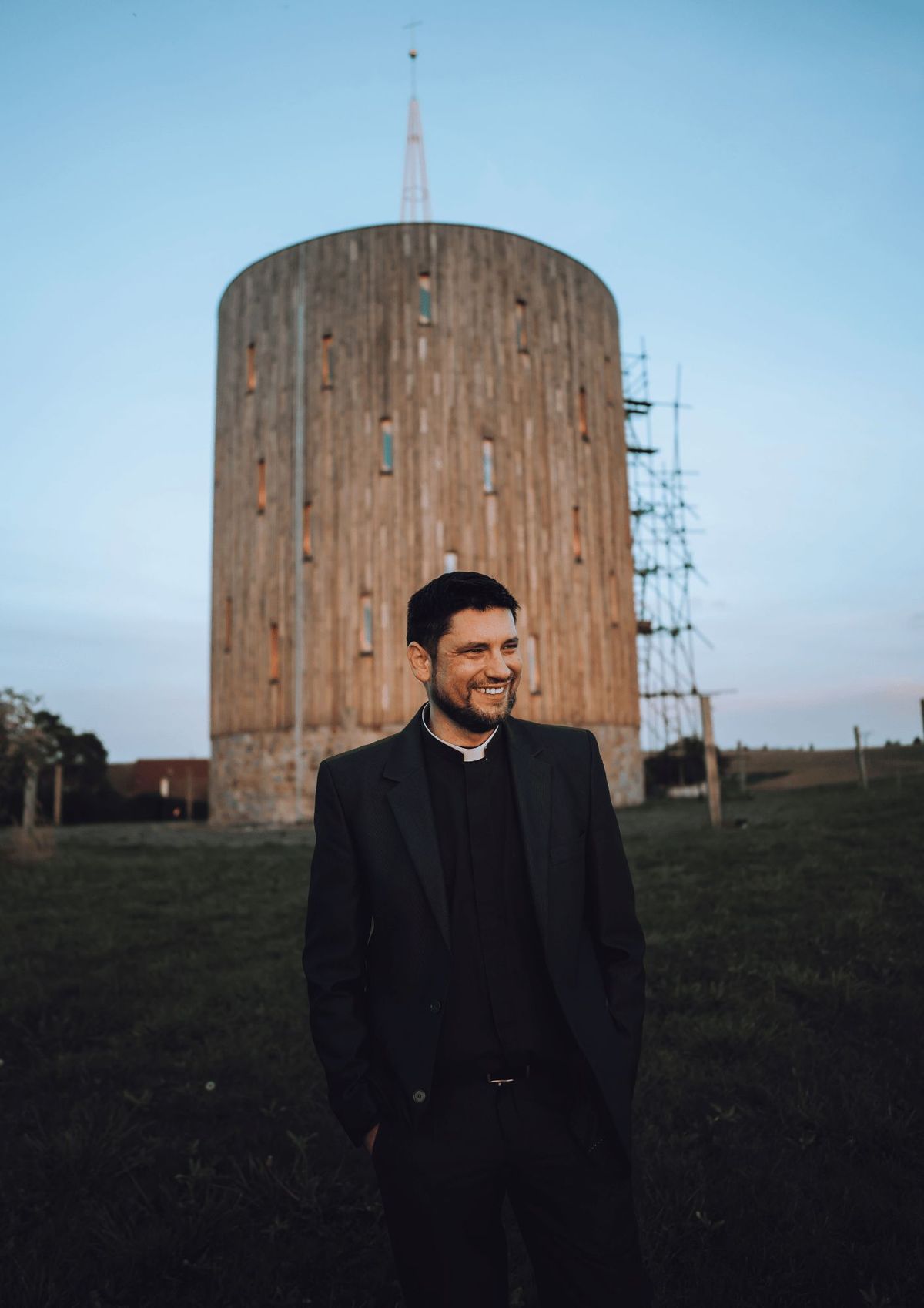 Kněz Václav Strouhal v pozadí s kaplí Nesvačilka