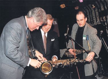 Americký prezident Bill Clinton přebírá od Václava Havla saxofon s jeho podpisem, 1994