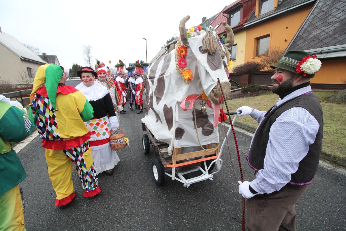 Celý průvod vedl pasáček s krávou, nechyběli ani kašpárci, laufr se ženou, kobyly, rasové, kominíci, slamění či policajti. Ti si dokonce vzali na pomoc psa. Maškary mají náročný úkol obejít celou obec, k tomu vydržet vydatný přísun alkoholu a večer se ještě zúčastnit plesu spojeného se symbolickým poražením krávy.