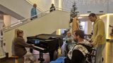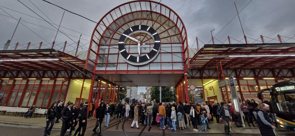 Dopravní terminál v Liberci a lidé, kteří se tlačili kolem klavíru