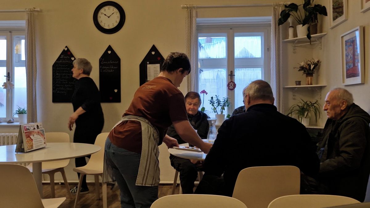 Naopak Matěj s Downovým syndromem, který se špatně dorozumívá, je evidentně šťastný „na place“. „Jsem rád mezi lidmi, líbí se mi to,“ hlásí hrdě mladý muž mezi roznosem objednaných káv a zákusků.