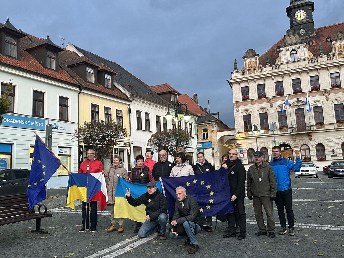 „Hned po ruské invazi přišlo Ukrajinu na náměstí podpořit na dvě stovky lidí. A hned ten den jsme si slíbili, že sem na náměstí budeme každý pátek chodit tak dlouho, dokud Ukrajina nevytlačí Rusko tam, kam patří,“ líčí Pavel Horáček, který v České Lípě v minulosti provozoval knihkupectví s kavárnou a každé setkání na podporu Ukrajiny na náměstí moderuje.