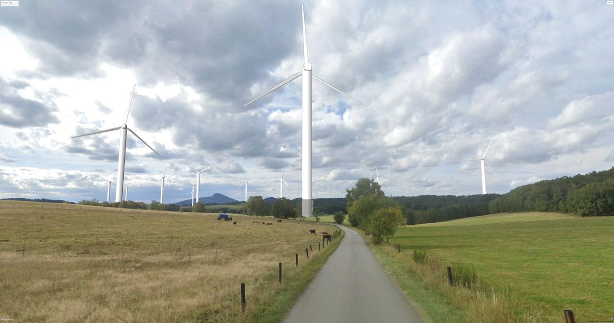 Vizualizace ukazuje, jak by s větrnými elektrárnami vypadaly konkrétní místa v Ralsku - Náhlově, kde mají větrníky opravdu vyrůst.