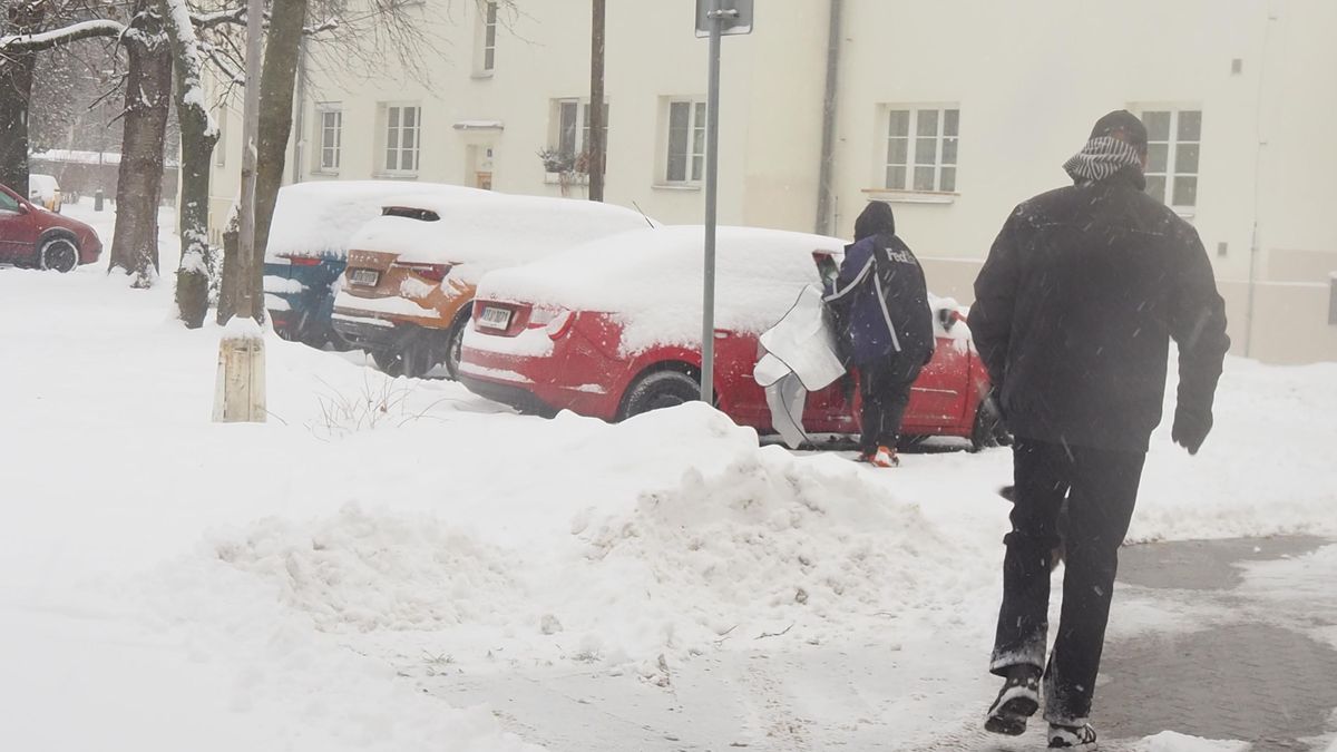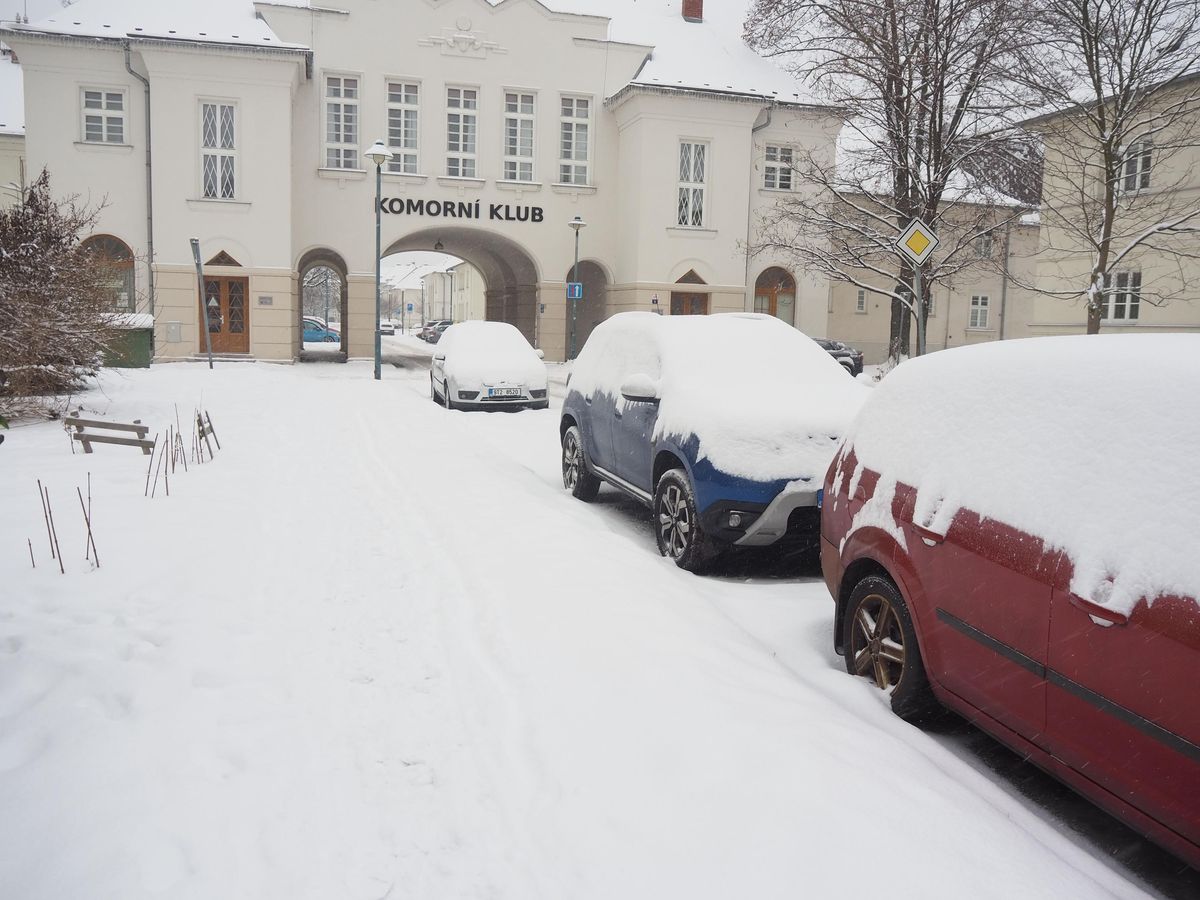 Sníh zasypal auta v ostravských ulicích. Do toho dál silně sněží.