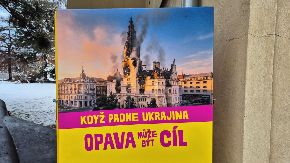 Na plakátech vystavených s dronem lidé v Opavě vidí, že pokud padne Ukrajina, mohou tytéž zbraně zničit třeba i jejich městskou chloubu, radnici.