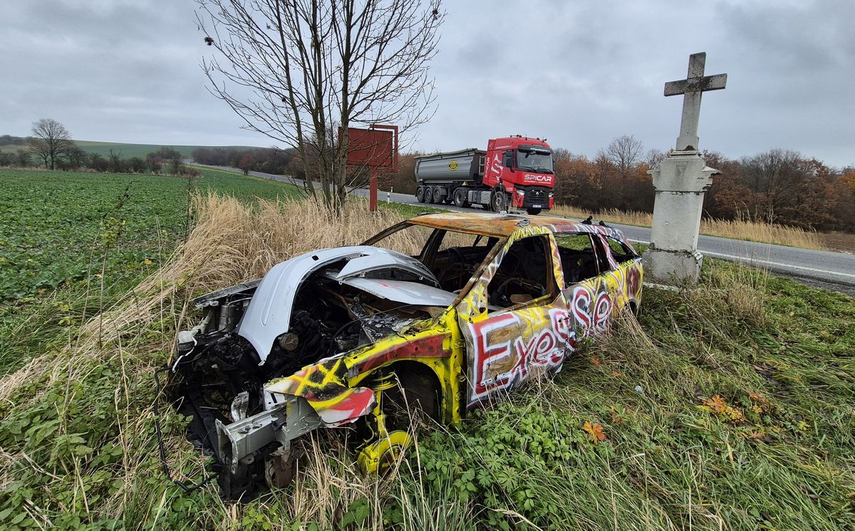 To, co za rok a půl zbylo z havarované škodovky nedaleko Heltínova.
