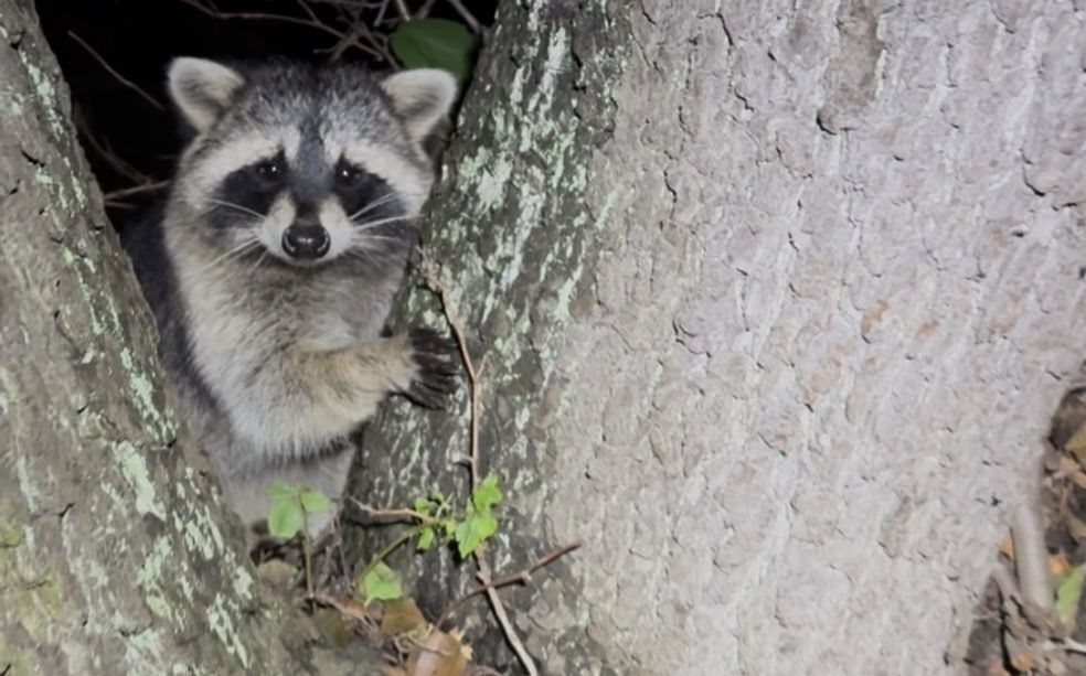 U potoka školák mývala vyfotil, když na něho vykukoval za stromem.