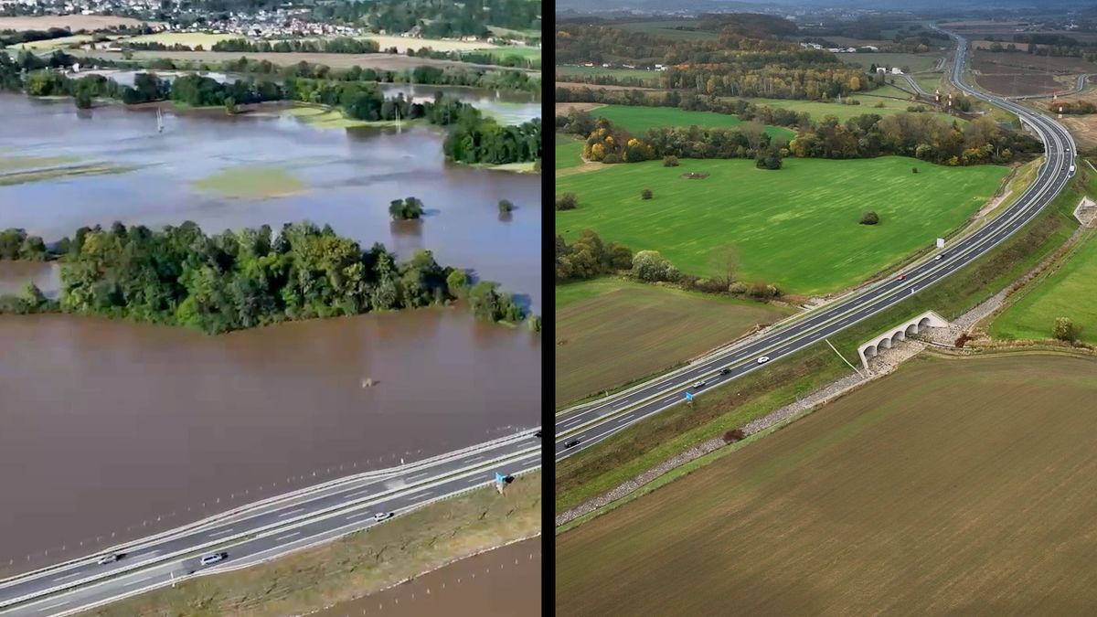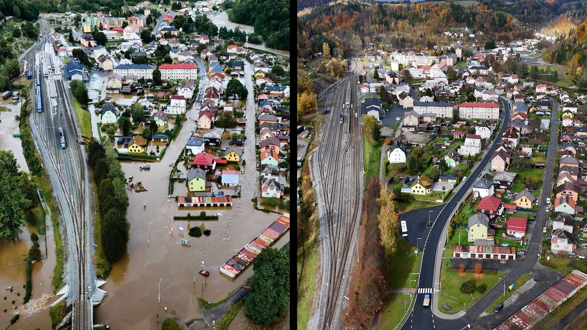 Dronové záběry z tehdejší doby ukazují široké pásy vody rozlité v krajině mezi oběma městy. Tam, kde jsou dnes opět oraná pole a zelené plochy, byl loni jednolitý hnědý „rybník“.