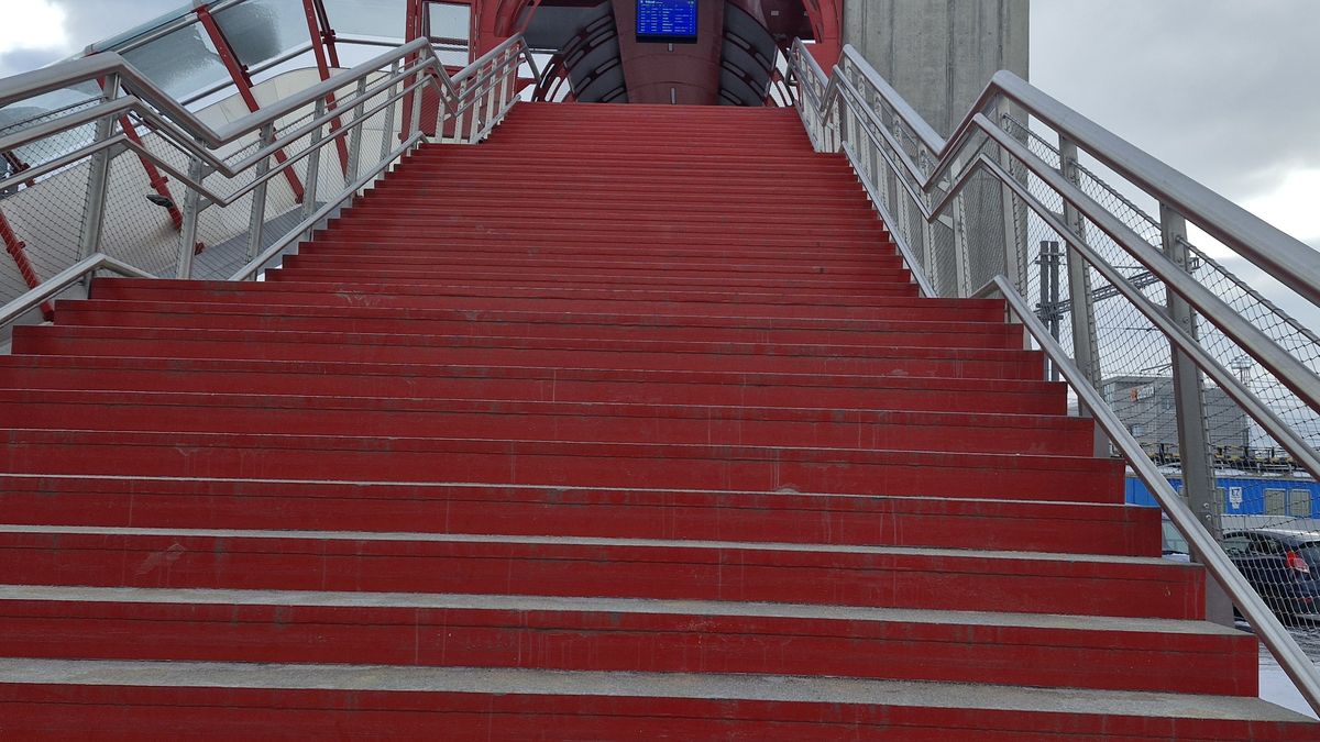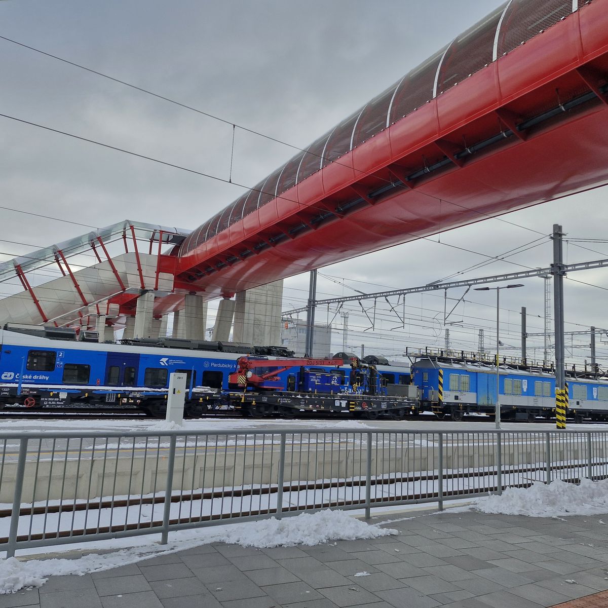Červená lávka stála 300 milionů korun, měří 290 metrů. Na obou stranách je opatřená výtahem i schody. Z ní vedou tři ramena s jezdícími schody, aby lidé měli přístup na nástupiště. Boční části lávky jsou vyplněné mříží, díky tomu je výhled na kolejiště.