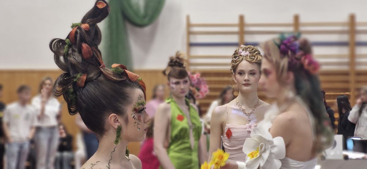 Z tělocvičny vzniklo několik malých improvizovaných kadeřnictví, stolek pro dva soutěžící půlila zrcadla. Za hodinu mělo třiadvacet mladých kadeřníků vytvořit účes na téma imaginace květin.