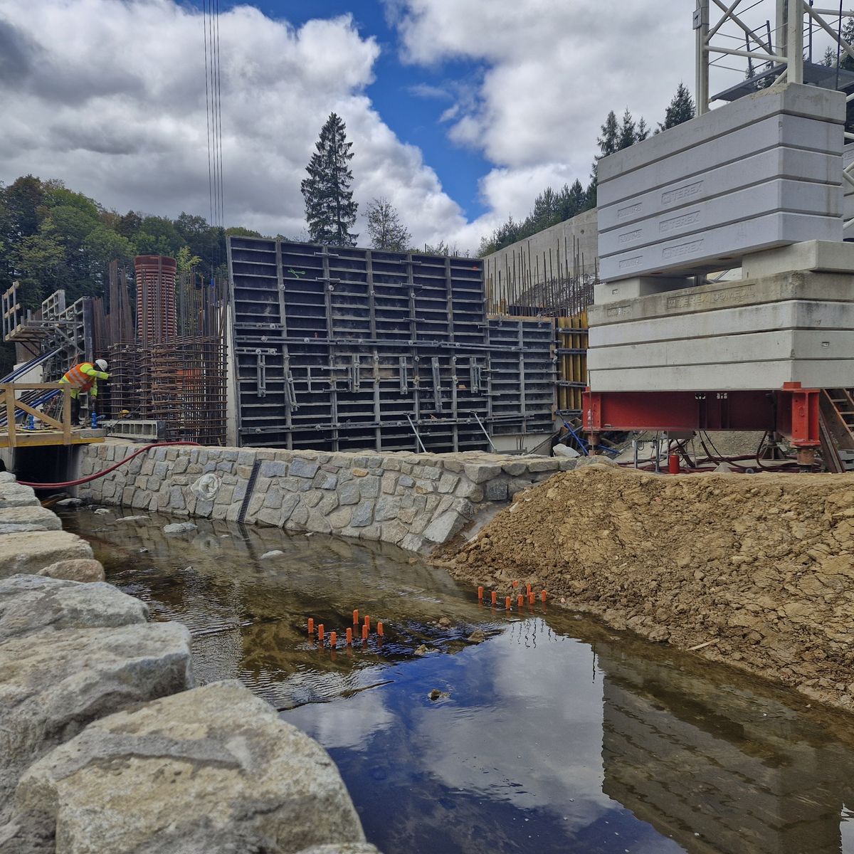 Stavební dělníci aktuálně převedli tok říčky Krounky z provizorního obtoku do vybudovaného migračního prostupu v betonové konstrukci hráze. Na staveništi jsou momentálně nasazeny přibližně tři desítky pracovníků, v pracovní špičce jich tu bude kolem stovky.