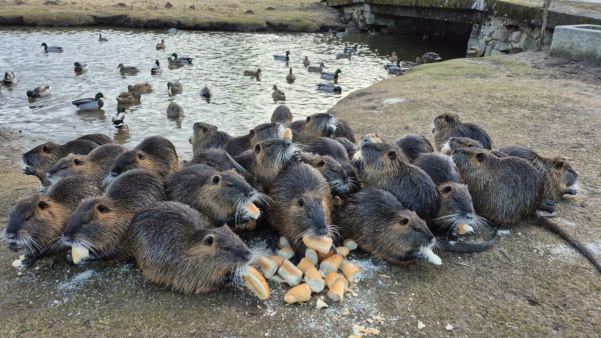 Krmení nutrií v Tojících na jižním Plzeňsku