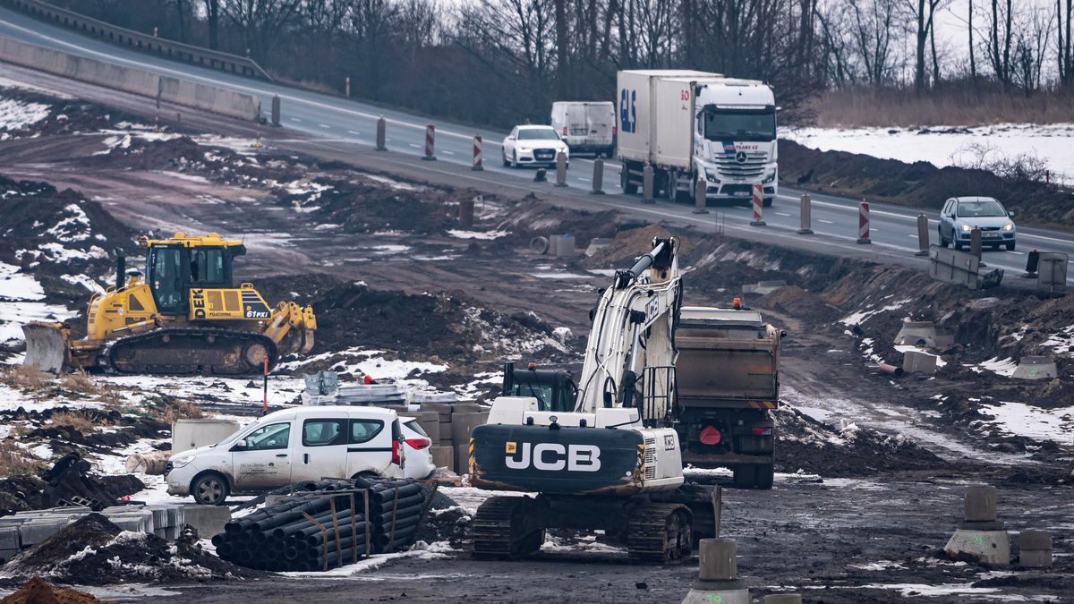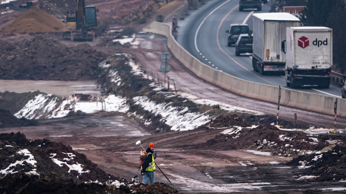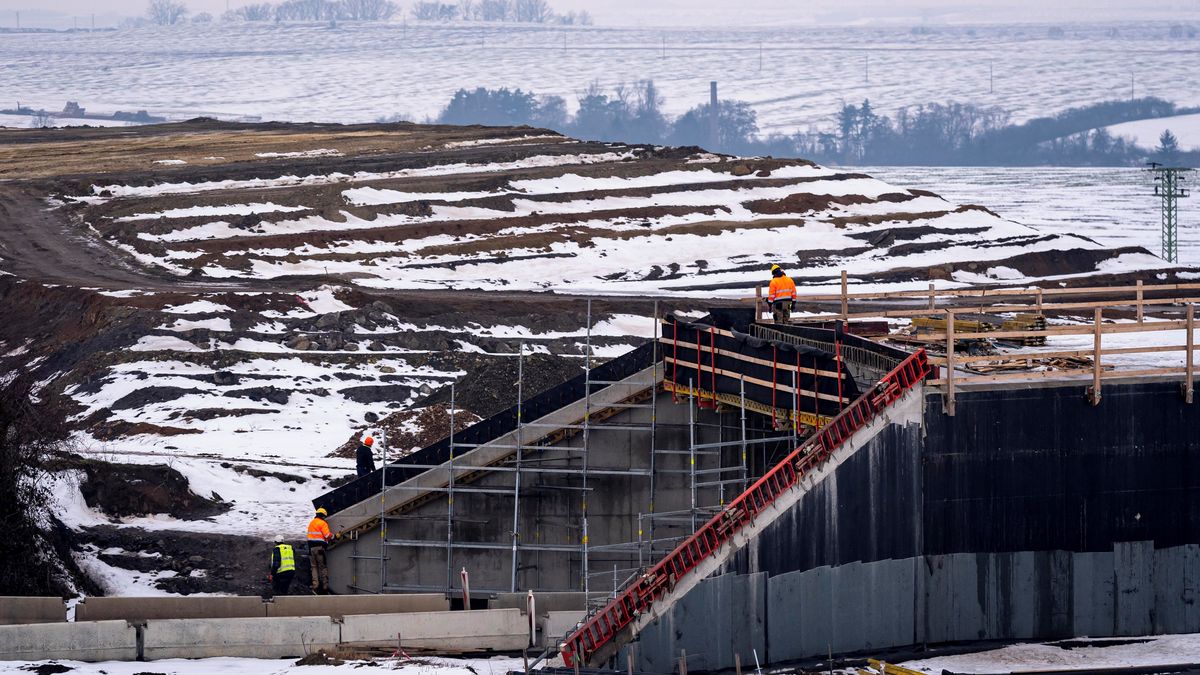 Stavba dálnice D7 v úseku Slaný západ-Kutrovice na snímku z 28. ledna 2026.