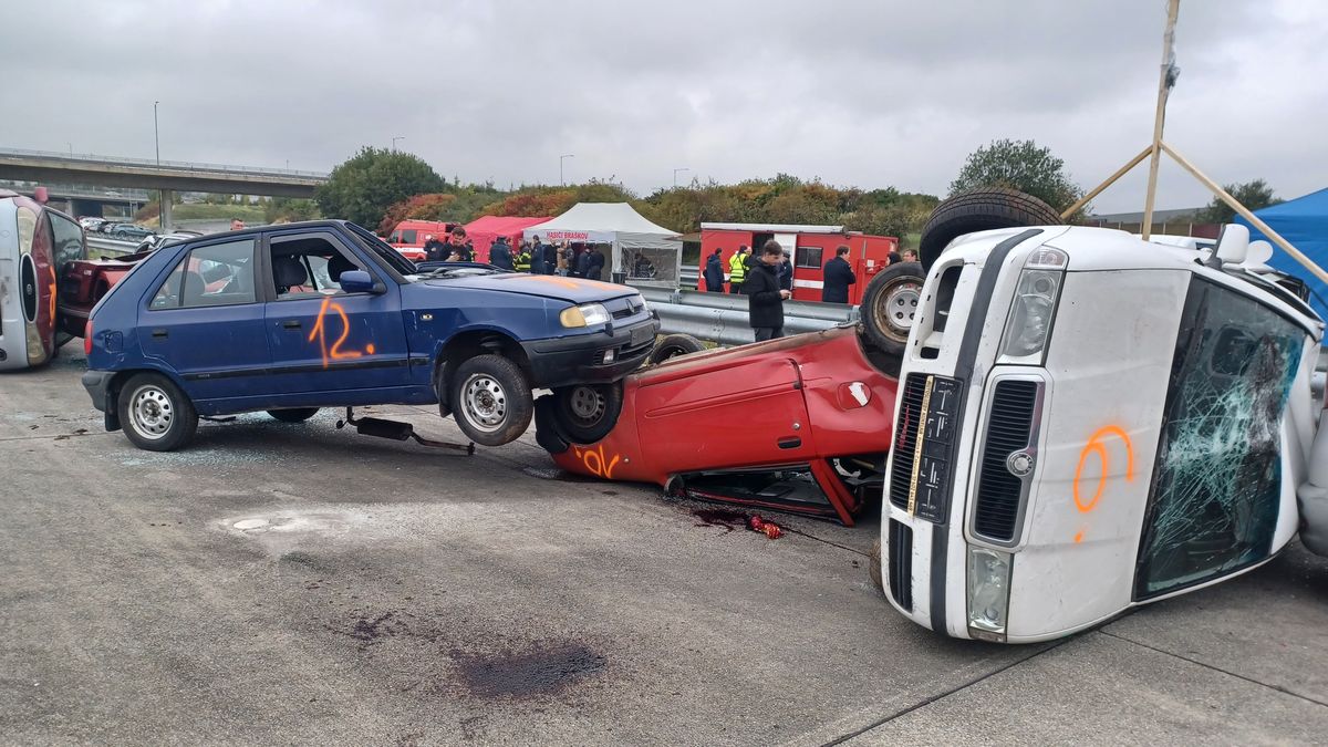 Na nedostavěné části Pražského okruhu je nasimulovaná hromadná nehoda několika osobních aut i nákladního auta převráceného na bok a také evakuace autobusu převážejícího vězně.